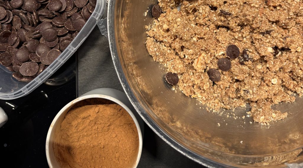 Hebe zum Schluss die Schokodrops sowie die gehackten Nüsse unter den Teig.